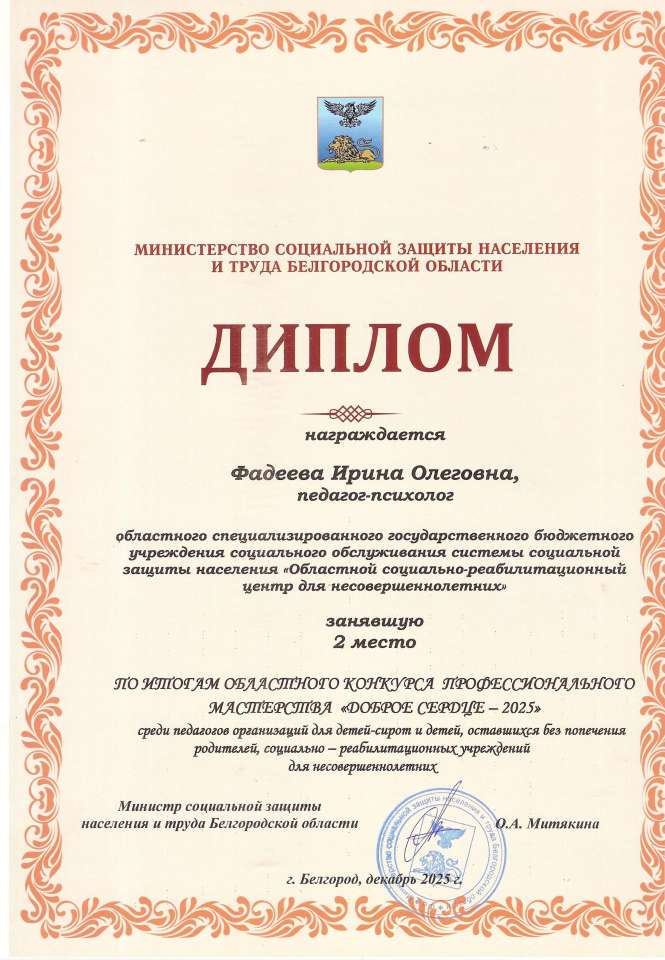 Фадеева Ирина Олеговна работает педагогом - психологом ОСГБУСОССЗН "Областной социально-реабилитационный центр для несовершеннолетних".